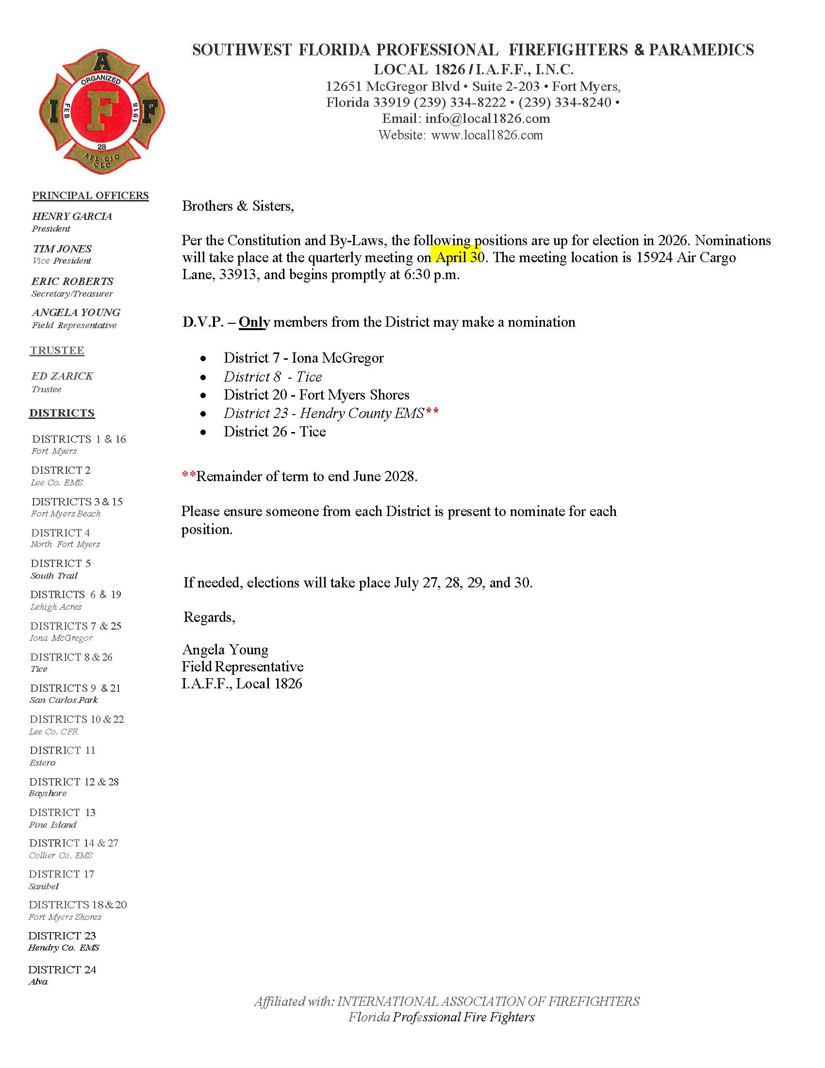 Jan 28, 202715924 Air Cargo Lane Ft. Myers, 33912 @ 6:30 p.m. Member of the Year Announced., Const. & Bylaw changes vote. Nominations for the offices of Sec/Treasurer, Field Rep., & DVPsApr 29 Thu Local 1826 Quarterly Meeting